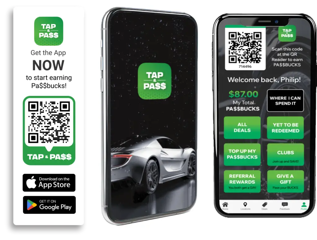 The TAP & PA$$ App gives customers a super easy way to collect PA$$BUCKS loyalty currency at participating retail locations and use it to pay for your car care services by simply scanning the QR code at the appliance you wish to use. Choose from the many deal options to make your carwash experience even better!